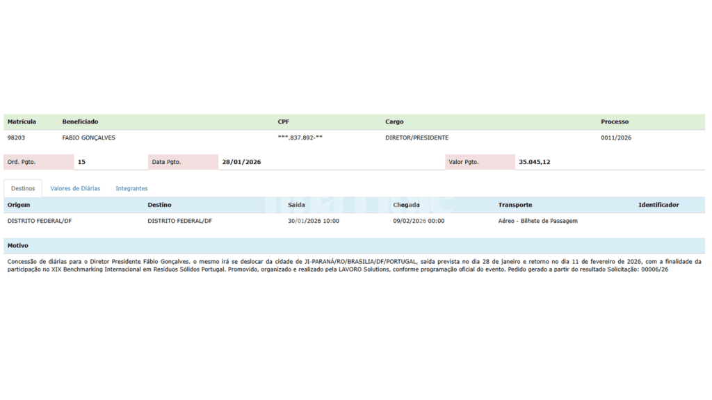O Portal da Transparência da administração pública de Ji-Paraná trouxe à tona, nesta semana, um gasto que promete reacender o debate sobre a ética no uso do dinheiro dos contribuintes. O Diretor-Presidente da Agência Municipal de Regulação de Ji-Paraná (AGERJI), Fábio Gonçalves, solicitou e obteve a concessão de diárias internacionais para uma viagem a Portugal, totalizando o expressivo valor de R$ 41.445,12. A viagem, prevista para ocorrer entre os dias 28 de janeiro e 11 de fevereiro de 2026, tem como justificativa a participação no XIX Benchmarking Internacional em Resíduos Sólidos. No entanto, o montante e o destino levantaram uma onda de questionamentos sobre a real necessidade de tal investimento para o município.