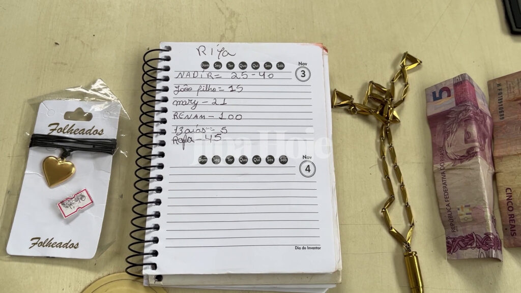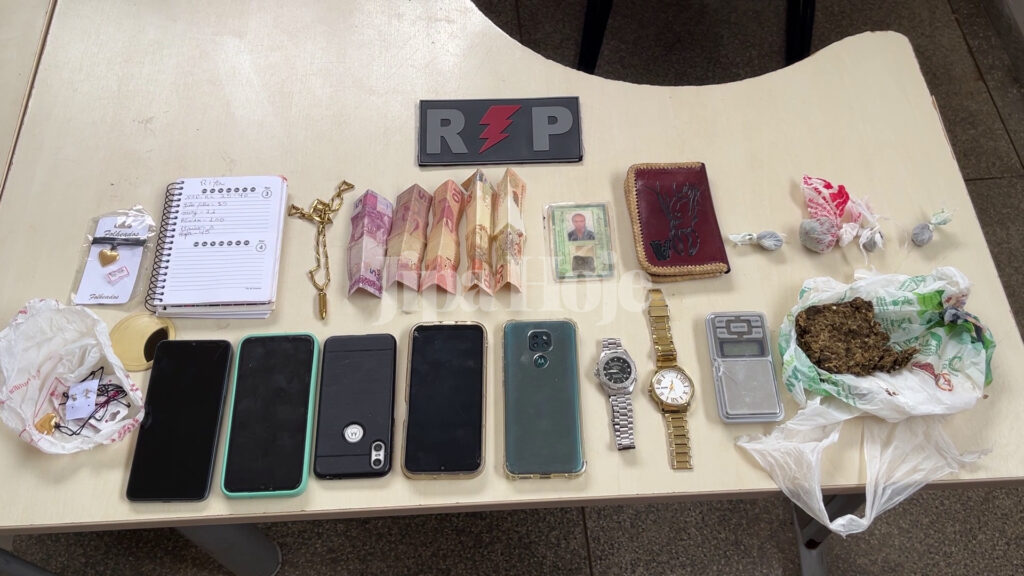 Durante as buscas, os policiais apreenderam quatro trouxinhas de maconha, uma balança de precisão, dinheiro em espécie, anotações que indicavam a movimentação de venda de drogas, quatro celulares, um televisor sem nota fiscal, relógios, cordões, bijuterias e duas botijas de gás sem origem comprovada.